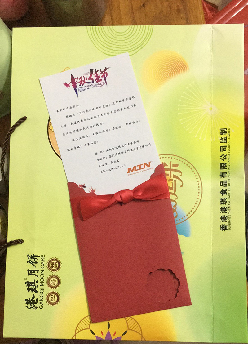 中秋佳節來臨之際,邁騰電子集團及子公司為全國各地的邁騰家人寄送月餅及精美賀卡,為家人送上濃濃的中秋祝福和滿滿的愛意。
